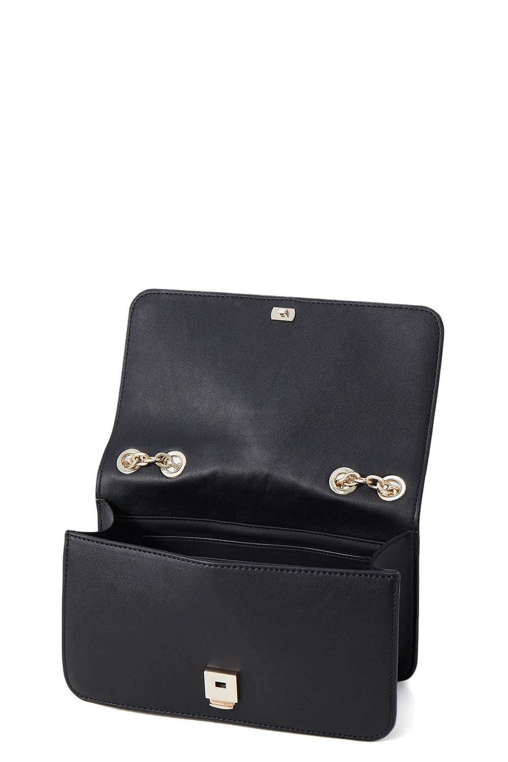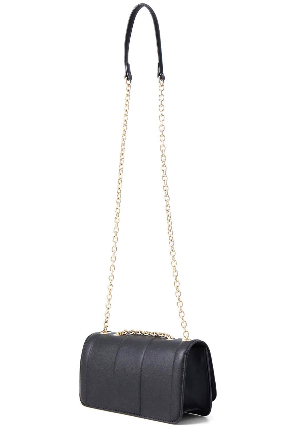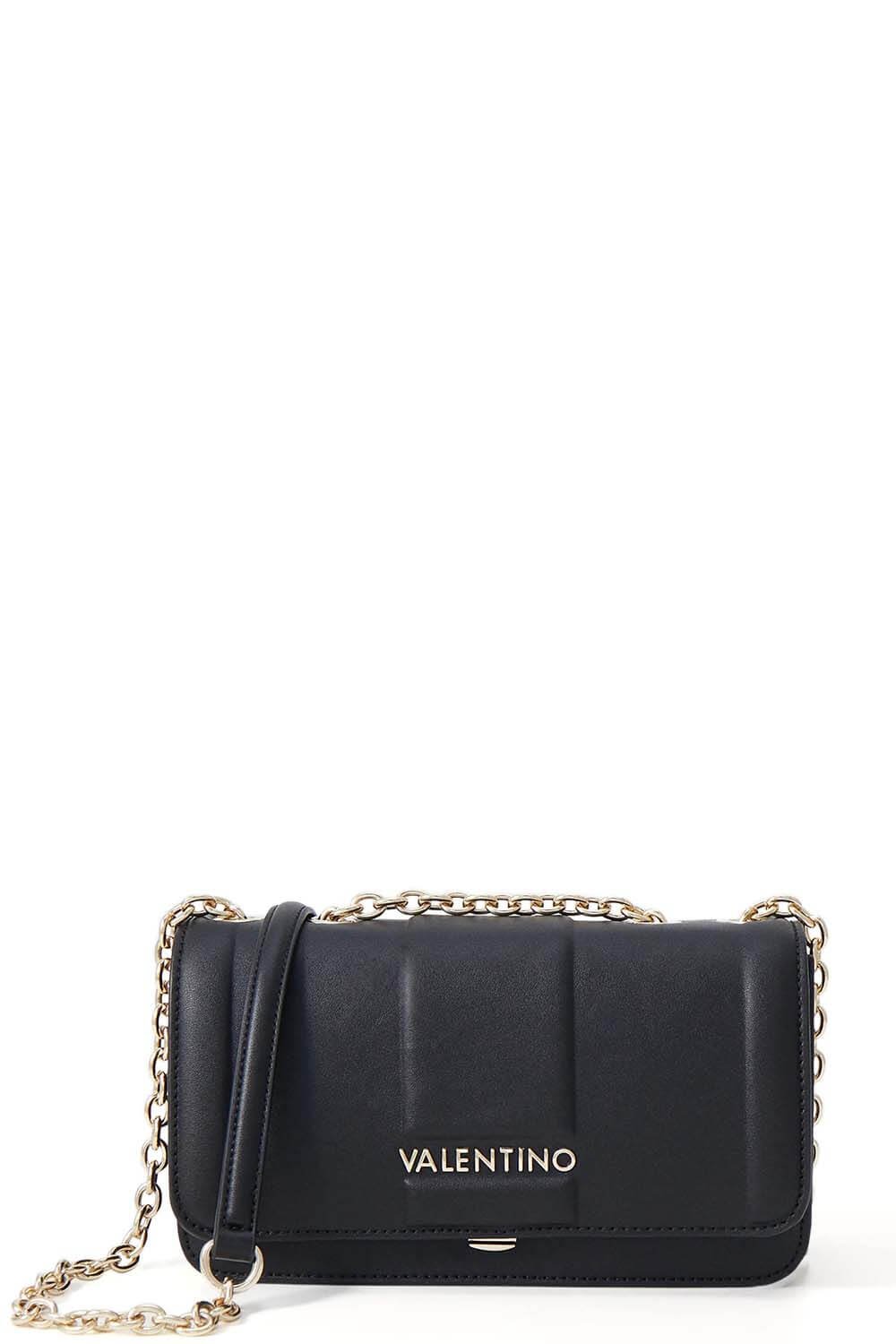 Sac bandoulière Mario Valentino BRASS en laiton VBS8G609 550 Noir ;porté croisé avec chaîne noire et détails dorés.